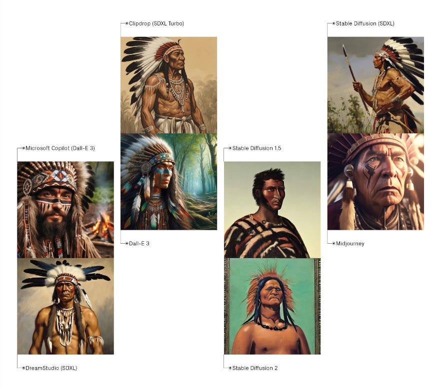 They experimented with multiple models, and got a variety of results, all problematic in their own ways. “Everything from Coachella-style, fetishised images to really horrible ones,” explained Ghosh. The men wore exaggerated headdresses; several were white men in costumes; and many were topless, more akin to Disney’s Pocahontas than reality. Some renderings even had a grim colonial tone.
