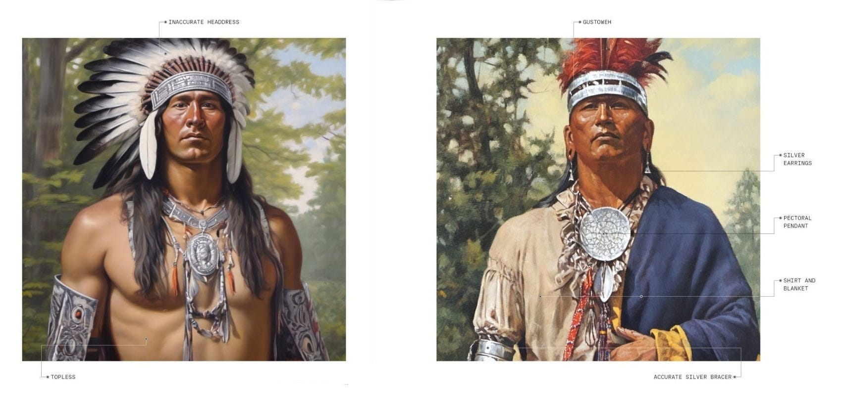 Instead of giving up though, they thought about it practically – these AI systems likely had no real Indigenous representation, so what if they could provide it. The studio had 25 years’ worth of cultural research from within First Nations communities and they could source even more through their networks. They built a massive training set of historical imagery and artwork, and heavily annotated it, then did thousands of generative iterations. Every update made the generated images more accurate: appropriate clothing (the Haudosaunee were in the North of North America, where being basically nude would not have been practical for most of the year); narrow, often red, feathered gustoweh headdresses; and silver accessories to indicate rank.